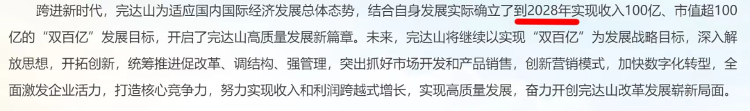 另据公司官网显示,完达山2019年提出的2025年达成业绩、实现营收一百亿元、市值一百亿元的“双百亿”战略目标,目前也已经更改为2028年实现。对此完达山表示,更改目标的原因是“结合自身发展实际”。