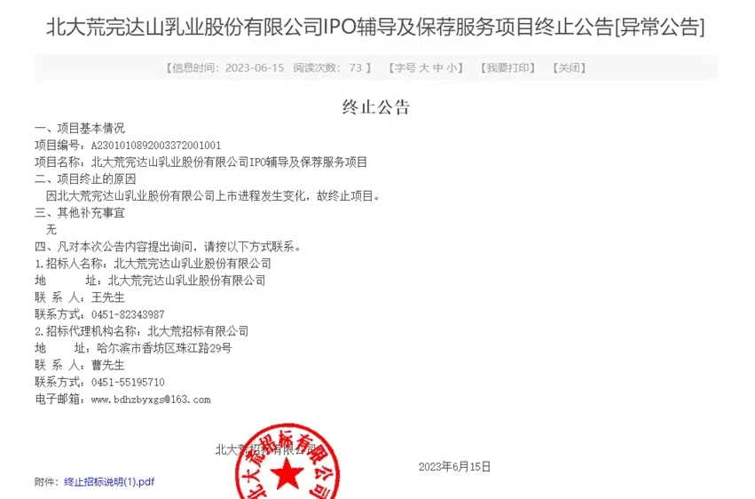 6月15日,北大荒电子招标平台发布《北大荒完达山乳业股份有限公司IPO辅导及保荐服务项目终止公告》。公告显示,因北大荒完达山乳业股份有限公司上市进程发生变化,故终止项目。