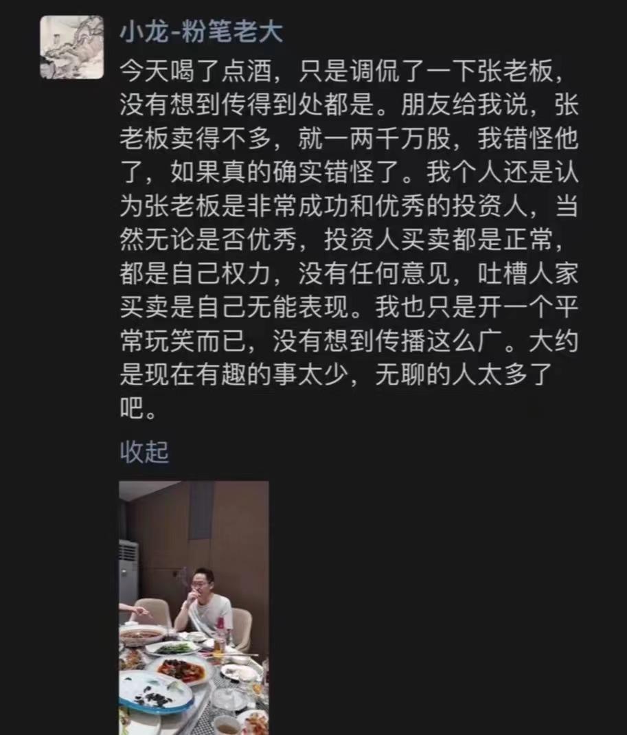 不到一天,张小龙再发朋友圈:“朋友给我说,张老板卖得不多,就一两千万股,我错怪他了。投资人买卖都是正常,都是自己权力,没有任何意见,吐槽人家买卖是自己无能表现。”
