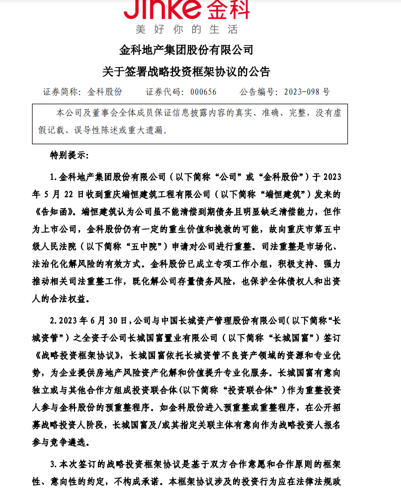 其中最为重要的是签署战略投资框架协议的公告,称金科股份与中国长城资产管理股份有限公司(以下简称长城资管)之全资子公司长城国富置业有限公司(以下简称长城国富)签订《战略投资框架协议》。