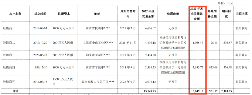 报告期内,贝因美对于前五大经销商中的两位经销商进行授信,年末应收账款余额为5649.17万元,占年末应收账款总额的10.51%,且2022年经销商应收账款回款占比为81.47%。