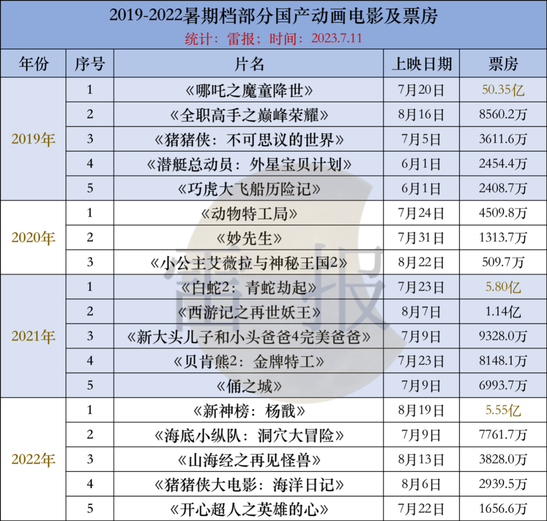而为了进行横向对比,我们还统计了过去四个年度的暑期档,国产动画电影的票房情况(仅统计该档期内票房排名前列的部分作品)。
