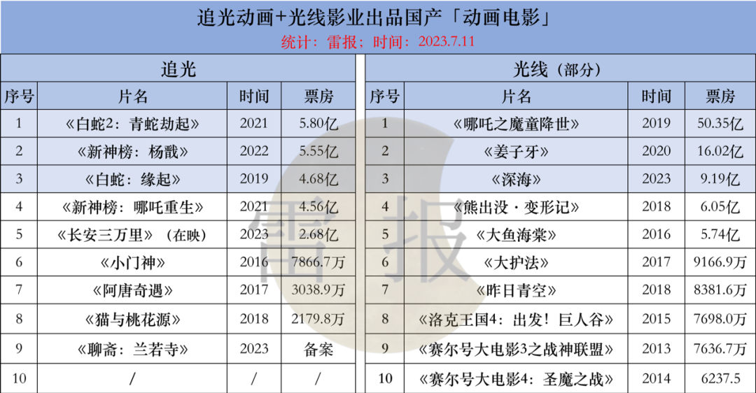 再来看“专业选手”。“追光动画”由土豆网创始人、前CEO王微于2013年3月在北京创立,志在以匠人精神,创作具有中国文化特色和国际一流水准的动画电影。成立至今,该公司推出了《白蛇:缘起》《白蛇2:青蛇劫起》《新神榜:杨戬》《新神榜:哪吒重生》《猫与桃花源》《阿唐奇遇》《小门神》等多部动画电影,除了极具中国特色,从票房来看,该公司的不少作品也取得了不俗的成绩,譬如旗下作品有2部超过了5亿。目前上映不久的《长安三万里》应该有能力刷新追光动画电影新的票房成绩。