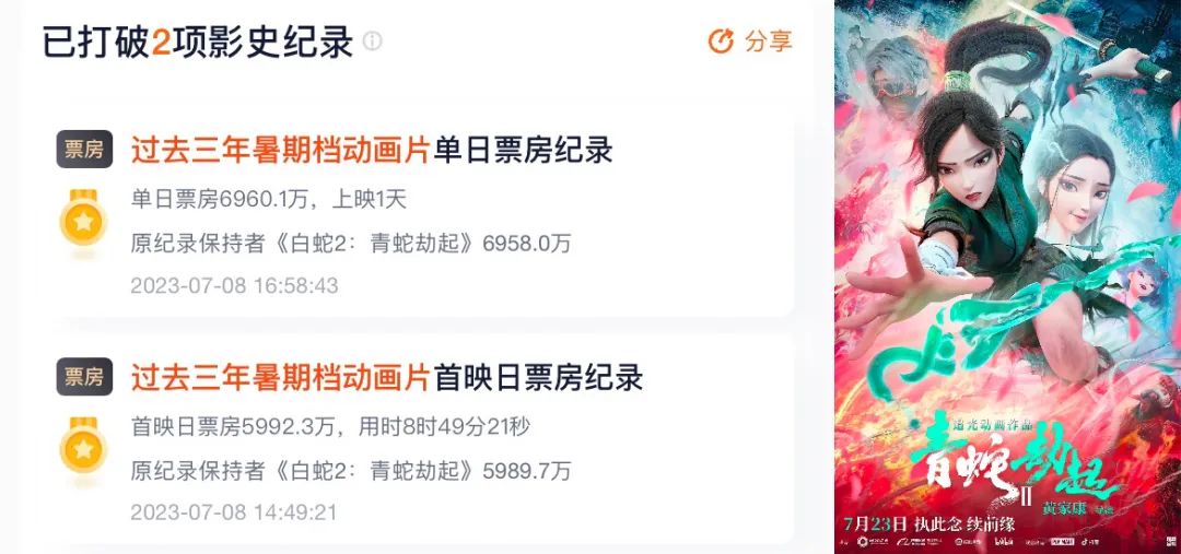 暑期档国产动画电影中,《长安三万里》表现亮眼,该作于7月8日上映,目前(7月11日下午统计)总票房已逼近3亿,同时其已打破了两项影史纪录,其一是刷新“过去三年暑期档动画片首映日票房纪录”,首映日票房5992.3万,用时8个多小时。原纪录保持者是于2021年上映,取得5.8亿票房的《白蛇2:青蛇劫起》;其二是《长安三万里》同样打破由《白蛇2》创造的“过去三年暑期档动画片单日票房纪录”,上映1天,单日票房为6960.1万。
