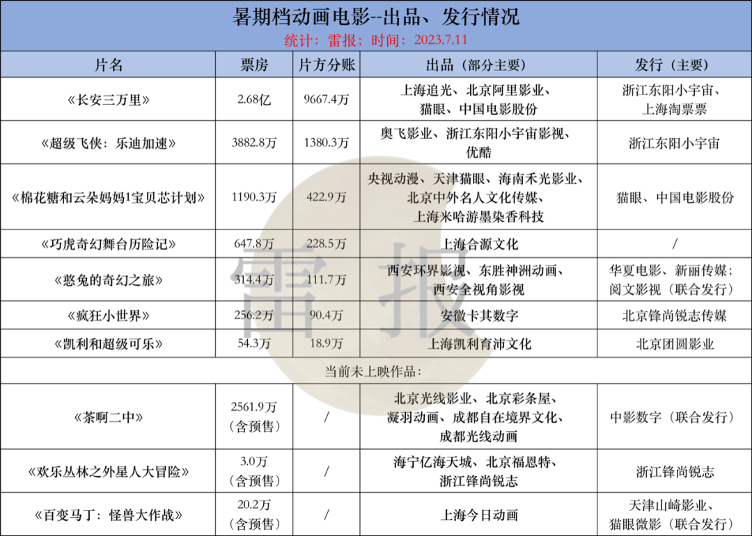 而从暑期档动画电影的出品及发行方来看。其中涉及不少动画或者说动画电影行业、市场的老兵,比如追光动画、奥飞、央视动漫、光线影业等等。