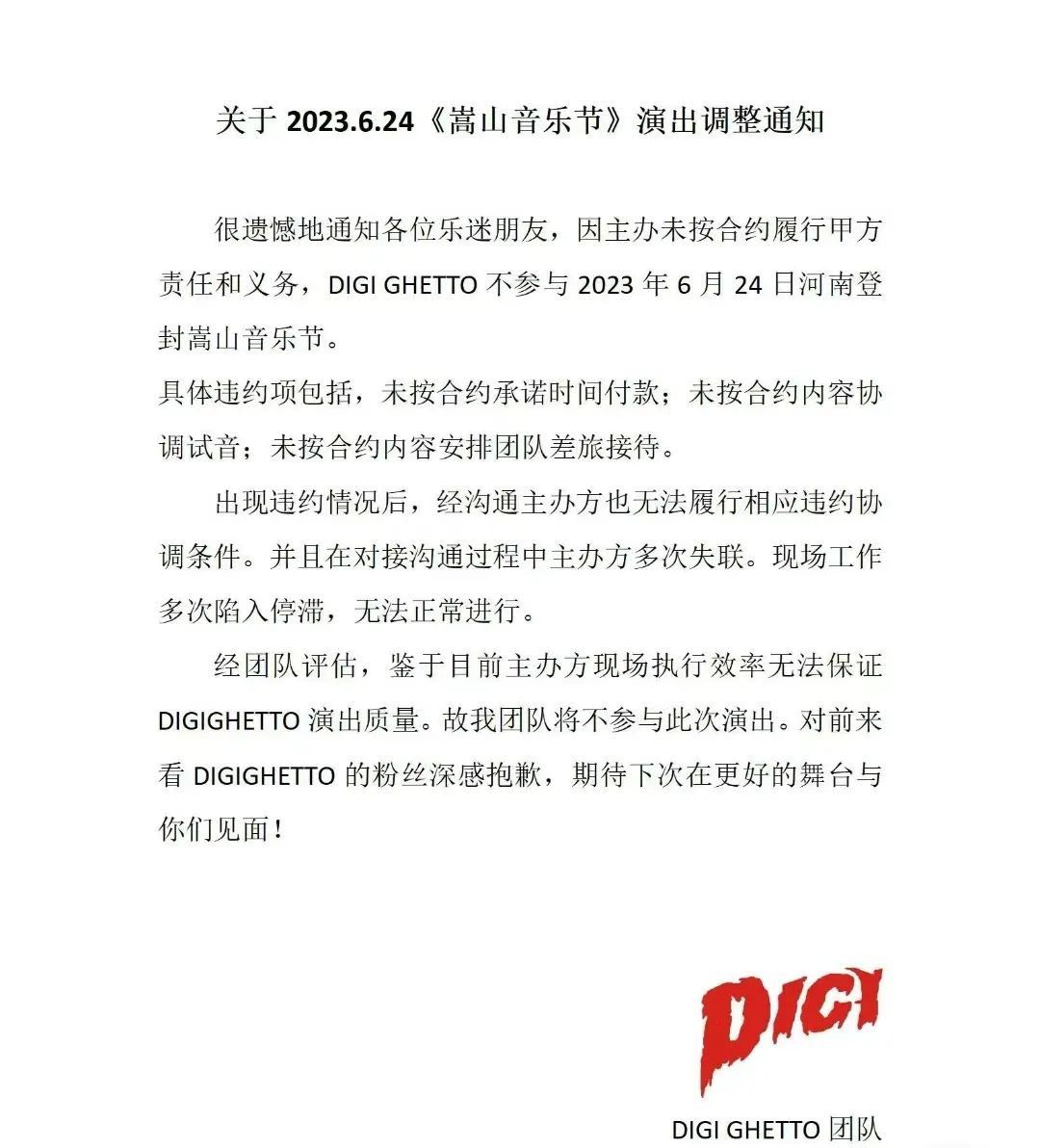 无独有偶,刚过去的嵩山音乐节也被乐迷细数包含跳票、抄袭、临时扩建场地、违约未提供艺人差旅接待等“六宗罪”行为;来自成都的DIGI GHETTO更是因主办方未按合约履行付款、协调试音且多次失联无法进行演出工作,无奈宣布退出嵩山音乐节。