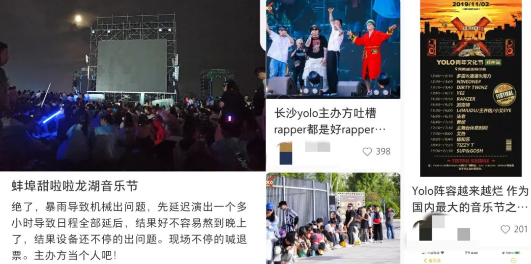尤其在今年演出市场复苏以来,愈来愈多的新音乐节扎堆入市,这一“审判”也更为频繁。不同音乐节品牌在消费受众心中形成了所谓的优先级排序,不少新生音乐节就被指为“野鸡”或“山寨”音乐节,进入音乐节鄙视链的底端。比如在社交平台上,魔音音乐节、芒禾音乐节、嵩山音乐节、雁栖湖音乐节等均因售票混乱、观演体验不尽人意等情况获封“野鸡”音乐节。