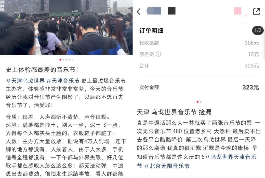 比如天津乌戈世界音乐节,便因高票价、露天沙土地演出且同质化严重的演出阵容,门票卖不出去,陷入不得不在开演前一日降价的尴尬境地,被乐迷吐槽“史上体验感最差的音乐节”。