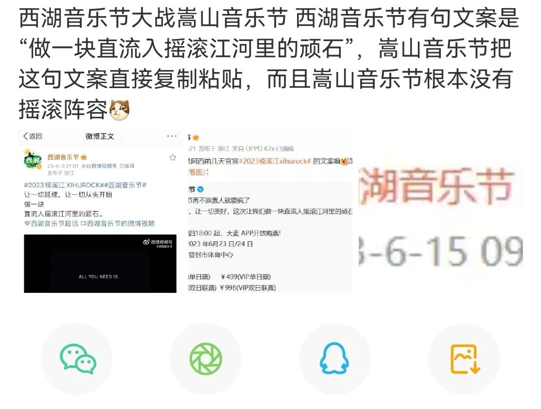 比如在6月底结束的嵩山音乐节,便因充斥着泰国流量艺人、说唱歌手阵容,且又在售票文案中疑似抄袭西湖音乐节文案自称“摇滚”,而被西湖音乐节官方吐槽“你也能摇滚?”,更有网友直指“割韭菜的拼盘秀,摇滚和音乐节的名号都被玷污了”。