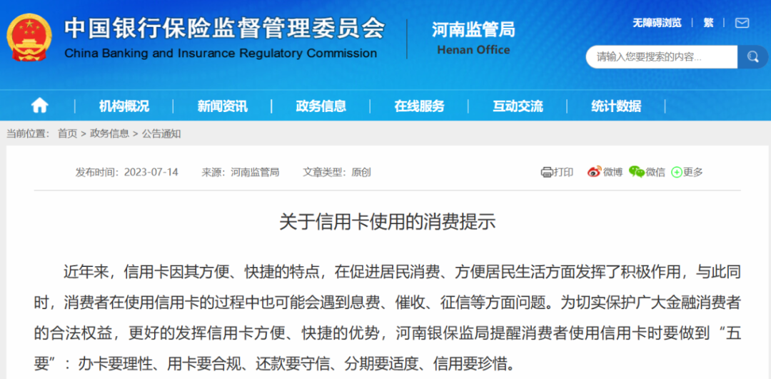 「支付百科」注意到,河南银保监发布了关于信用卡使用的消费提示,分别是信用卡办卡、用卡、还款、分期、信用等五个方面的消费提示,目的可能是提醒持卡人规避风险。