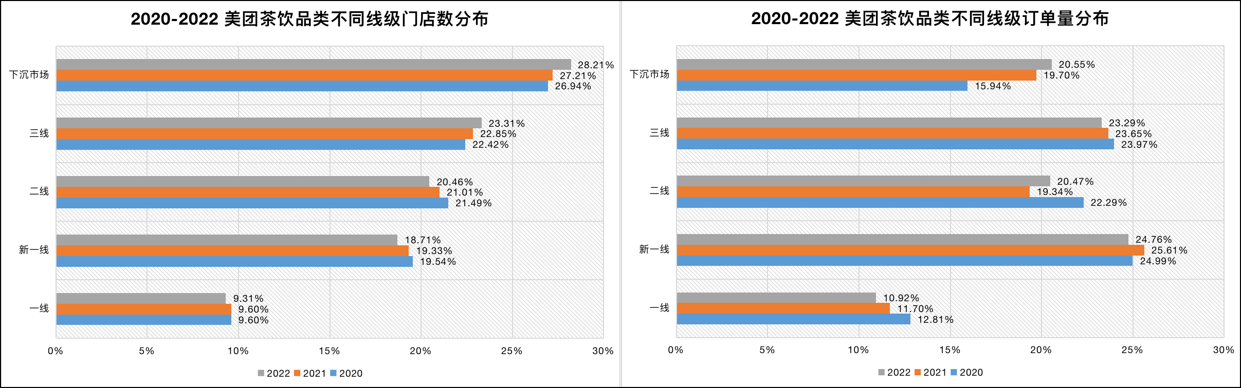 美团去年出过一个报告,揭示了过去三年不同线级城市茶饮品类的门店数和订单量分布变化,整体来说两个维度的数据中,只有下沉市场全都是增长。更可怕的是,在一线城市无论是门店数还是订单量,均在萎缩中。