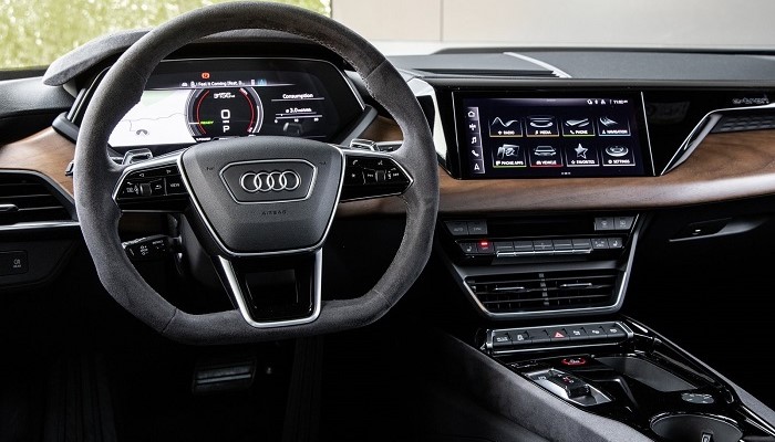 内饰方面,奥迪e-tron GT以驾驶者为中心形成环抱式座舱布局,中控屏及空调控制面板略向主驾倾斜。内饰采用纳帕真皮/Dinamica包覆仪表板,座椅采用专属定制的钻石银配色并搭配汉白玉白缝线,符合奥迪对该车的奢侈品描述。但需要注意的是,e-tron的车机系统未见明显亮点,这也暴露了奥迪品牌甚至是整个大众汽车集团目前在软件领域存在的短板。