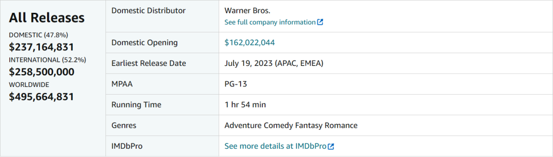 在《芭比》取得的爆炸性开画面前,所有前期的宣发投入都可谓物超所值。从业内的角度看,今年最为成功的两部电影—《超级马力欧兄弟大电影》和《芭比》—不无相似之处:两片都以享誉世界的知名品牌/形象为改编蓝本,同时面临过经年累月的开发瓶颈和外界质疑,最后均延揽出色的电影人参与制作且给予充分的创作自由,并以出色的整合营销赢得票房大丰收,而制作成本都控制在1亿到1.45亿美元左右。