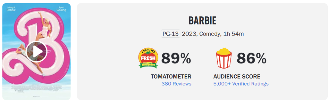 从口碑来看,《芭比》的烂番茄新鲜度达到89%,影评人称赞其为“一部视觉上令人眼花缭乱的喜剧,其元幽默与颠覆性的故事讲述巧妙地相得益彰”;同时《芭比》的爆米花指数也冲至86%,显示观众的满意度与主流媒体不相上下。