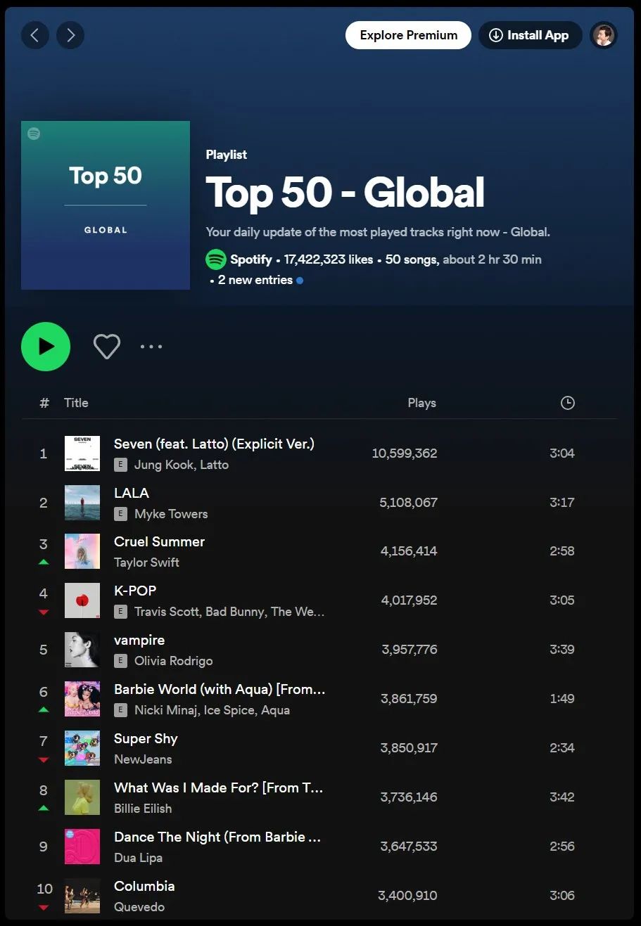 而在1997年由Aqua推出的著名单曲Barbie Girl也请来Nicki Minaj和Ice Spice来重新改编为Barbie World。在25日的Spotify全球播放量排行榜上,前述的Barbie World、由Billie Eilish演唱的What Was I Made For?和Dua Lipa的Dance The Night全部闯进前十名,凸显流行音乐和院线电影整合营销的高度同步性和有效性。