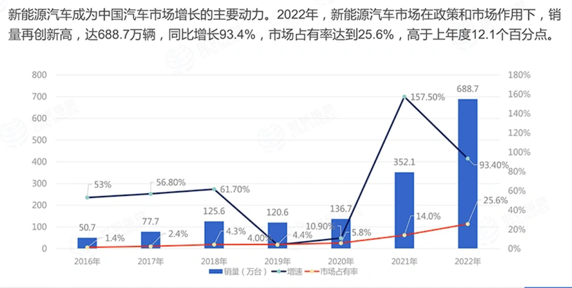 近两年,新能源车的火爆有目共睹。尤其在2022年,中国新能源汽车销售688.7万辆,同比增长93.4%,占到全球销量的61.2%。