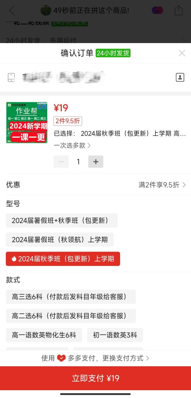 潘哥在拼多多上发现,有卖家售卖作业帮直播课程,初高中单科一学期售价19元,三科以上售价在30元至50元,销量超过3000件; 而在作业帮官方购买课程,初高中单科直播课,一学期售价在千元以上。
