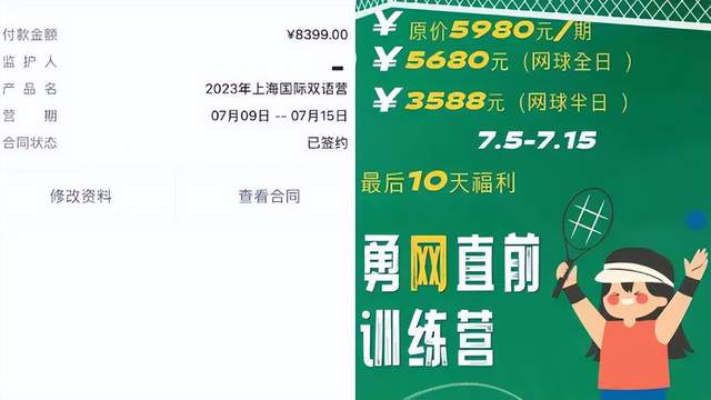 看女儿回来后对夏令营的反馈还不错,我又花了5680元,给她报了一个为期一周的“网球训练营”。每天早上9点上课,晚上5点放学。不过,尽管是小班授课模式,一个老师带4-5个学生,但说实话还是略贵了,我朋友带孩子在英国报了一个为期一周的网球主题夏令营,不包含住宿,一周才108英磅。