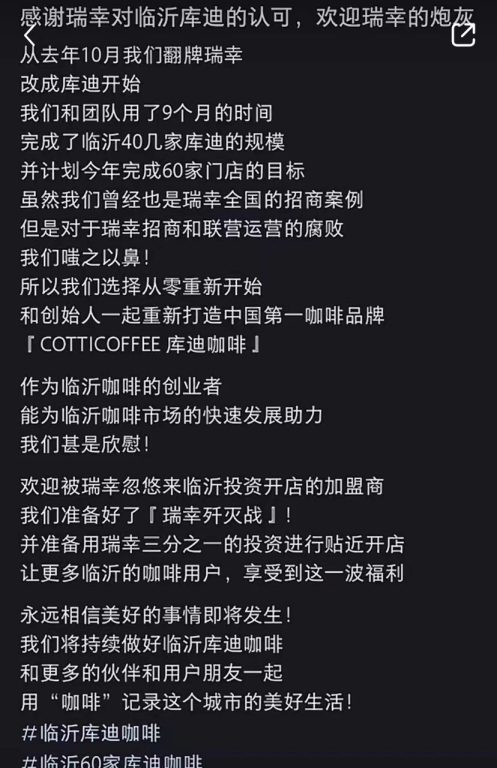 这位加盟商表示,他们用9个月的时间在临沂开了40几家门店,并准备用瑞幸三分之一的投资继续贴近开店。回应里的“瑞幸歼灭战”一词,算是彻底挑起了双方战火。