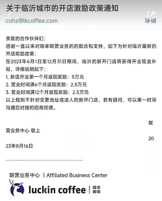 于是,就出现了开头所述,瑞幸对临沂新开门店联营商的政策激励。