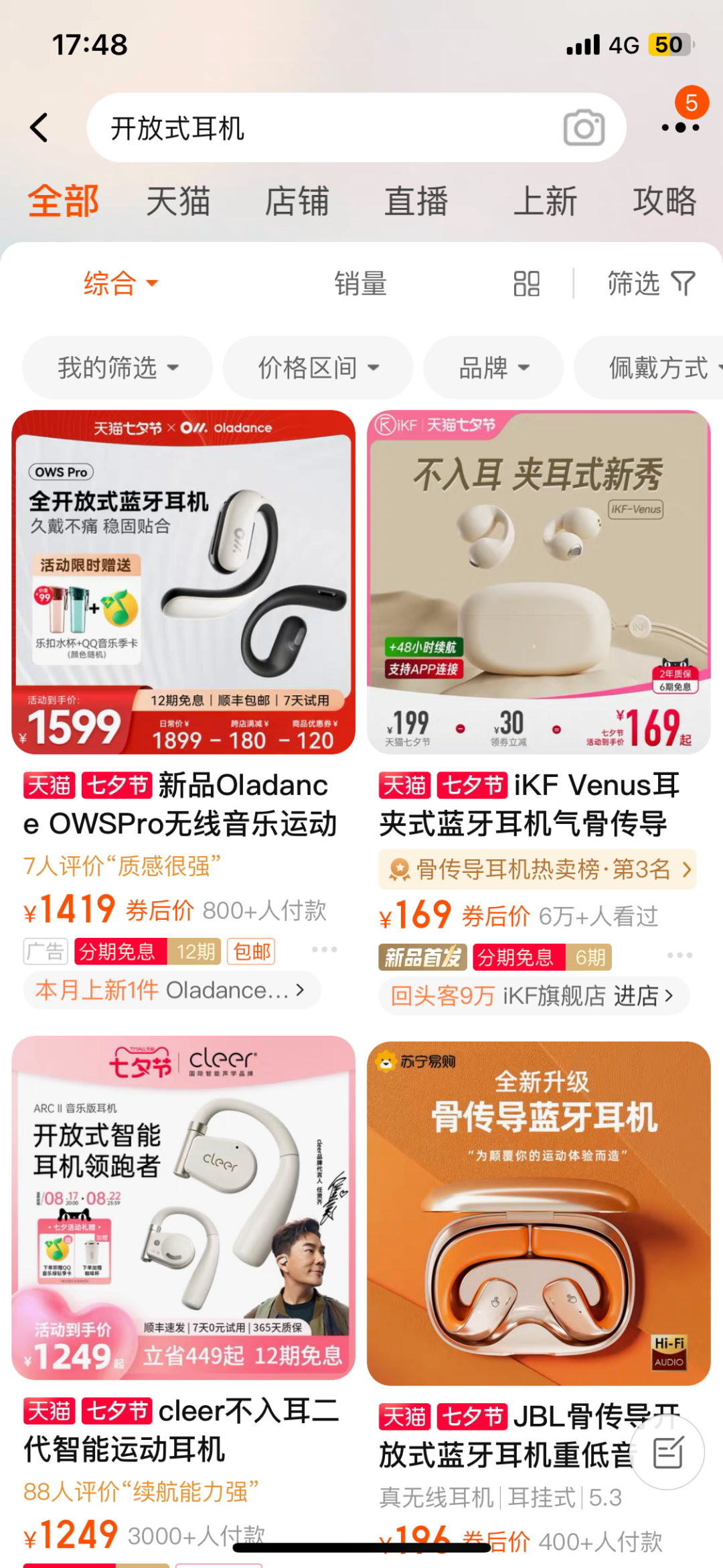 在耳机消费领域,千元级算是一个“分水岭”,岭头往上的品牌更加游刃有余,有利于产品之后布局在不同等级的消费领域。《天下网商》在电商平台注意到,目前主流市场上仅有Oladance、cleer、韶音、ambie等少数品牌能够跻身千元级,大部分是300元左右的开放式耳机,品牌和定价仍在接受市场最直观的考验。